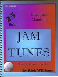 Bluegrass Mandolin Jam Tunes are my arrangements of 25 of the most common and most often played picking tunes, and are intended for the advanced beginner to the upper intermediated player. These are not for the beginner who is just starting out. Both books are written in standard notation and tablature, and are accompanied by 2 CD's each, with 3 practice tracks per tune, totaling over 2 hours of practice material. Each CD track has a guitar, mandolin and bass rhythm section. The 1st track is slow, with the melody and rhythm, so you can learn the melody and practice your rhythm playing as well. The 2nd track is the same as the 1st, but with the melody removed. Now you have a slow, backup band to solo over, to play my version of the melody or make up one of your own. The 3rd track is faster and goes 3 times through the tune starting with a mandolin solo, then a guitar solo, and then rhythm only, so you have a place in the tune to play your solo, just like in a real jam session. The slow versions are at 106 beats per minute, slow enough to learn, but not plodding. The faster version is fast enough to give you a good workout, but not up to performance speed. It is at 170 beats per minute. My students and others have told me, the tempos I've chosen are the perfect "in between speeds" for practicing, than other books/cds they've purchased to learn with. Not too slow and not too fast. Free samples of the Tab and Mp3's from the book may be downloaded at our website