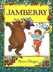 What a cute book! Bruce Degen tells the tale of a young boy and a jovial bear rollicking through a decadent world of fruit. The illustrations are luxuriant and detailed, composed of iridescent deep blues, reds, and purples. The text is catchy, with a Seussian quality: