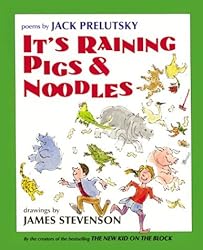 (More customer reviews)Jack Prelutsky's It's Raining Pigs and Noodles is a wonderful,imaginative collection of poems the whole family will enjoy, that willmake you smile, giggle, laugh and sometimes roar. His witty, sillyand often irreverent verses are full of wordplay, puns, jokes, andeven fun with shapes. Where else can you find out about Grungy Grace"I hardly ever brush my teeth or wash my hands and face..."or Plooters "We are Plooters, we don't care, we make messeseverywhere..." or Titanic Timmy Tinkletunes "that when heplays the violin, he has to use a cello." James Stevenson'ssimple, humorous, yet expressive black and while illustrations, addjust the right touch and compliment each poem perfectly. This is abook younger children will want to hear again and again, older kidswill want to read over and over and adults will just plain enjoy. Sosit back, put your feet up and find out why "I'm Ironing myRhinoceros", what happens to "The Dancing Hippopotami"and where "There was Unabated Chaos". You can't go wrongwith this book!
